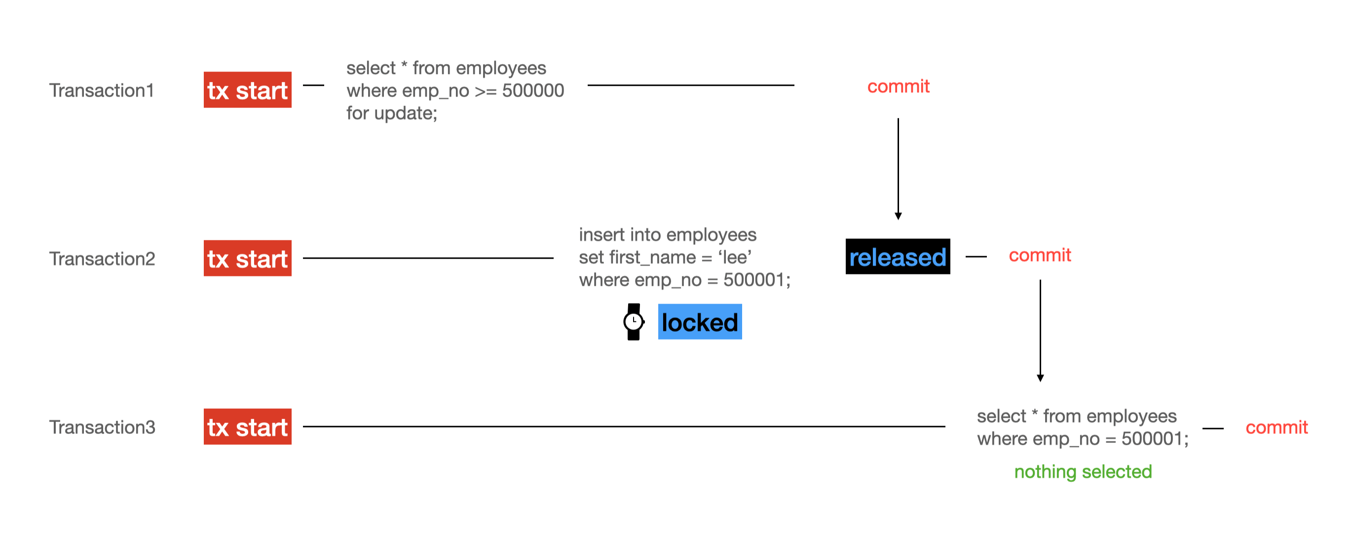 index되지 않은 column에서도 동일하게 동작했다. 위에서 index 기반 잠금을 한다고 말했는데, indexed column이 아니더라도 범위 조건으로 select ... for update 하였을 시 똑같이 잠금되긴 하였다. 추측하기론 잠금 획득을 위해 I/O를 통해서 해당 데이터들을 모두 가져와 잠그기 때문에 cost가 큰 조회 조건이라면 시간이 오래 걸릴 것으로 추측한다.