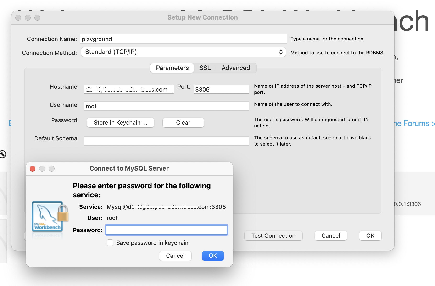 이제 MySQL Workbench를 실행해 connection name, hostname(public 도메인), port, username을 입력하고 접속하면 비밀번호를 입력한 뒤 정상적으로 DB 서버에 접속할 수 있다.