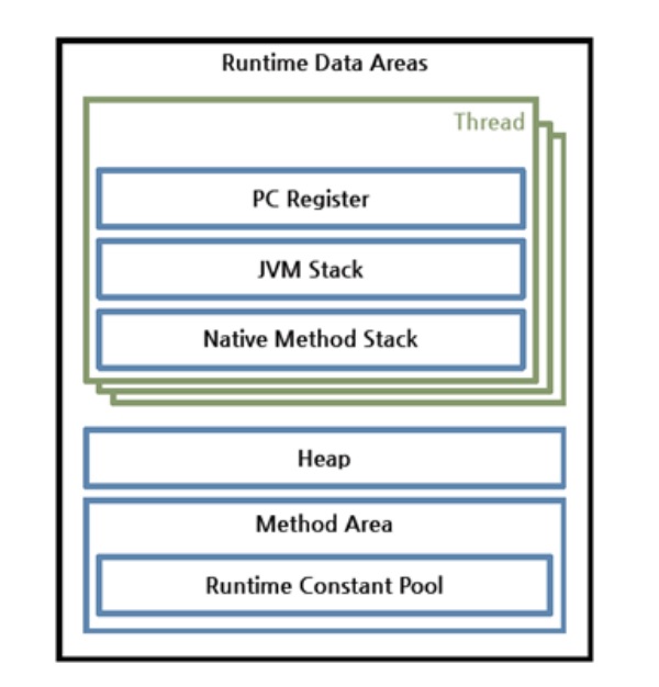 - 총 6개의 영역으로 나뉨(pc register/jvm stack/native method stack은 스레드마다 하나씩 생성되고, heap/method area/runtime constant pool은 모든 스레드가 공유)