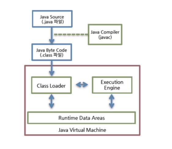 클래스 로더(Class Loader)가 컴파일된 자바 바이트코드를 런타임 데이터 영역(Runtime Data Areas)에 로드하고, 실행 엔진(Execution Engine)이 자바 바이트코드를 실행