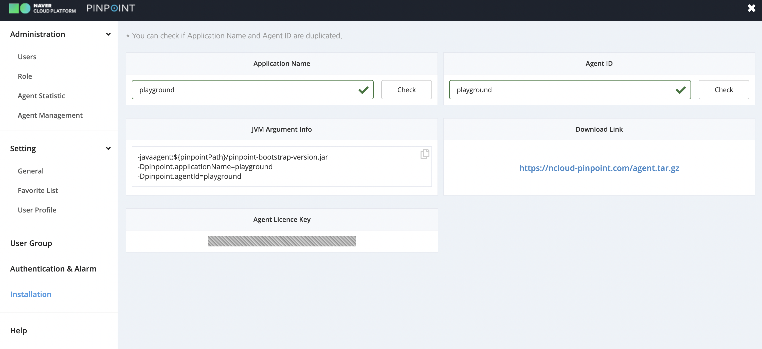 license key도 설정해야 하는데, settings의 'Agent License Key' 값을 pinpoint agent 설치 경로의 'pinpoint.license' 파일 안에 넣어준다.